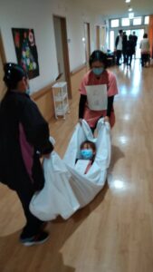 那賀消防の方の指導のもと、少ない人数でそれぞれ役割分担し避難経路、入居者さんの救助の仕方を確認👩‍🦽
