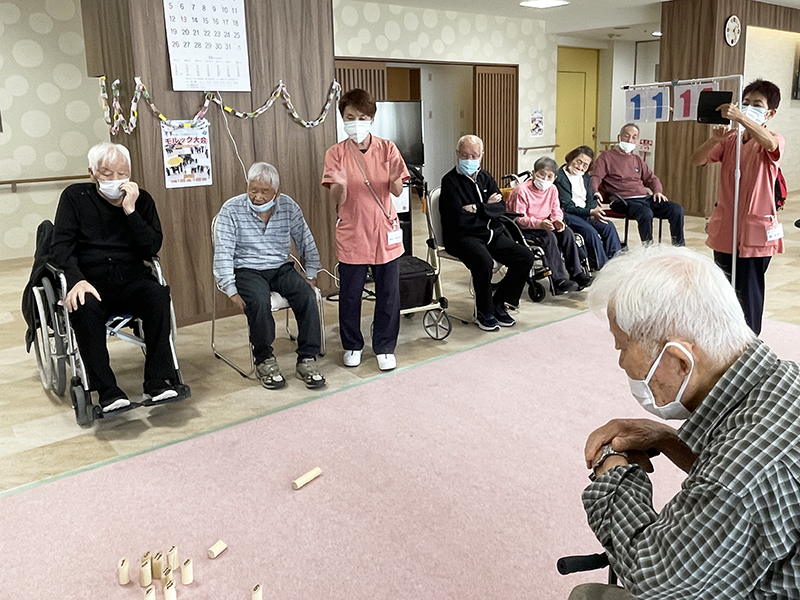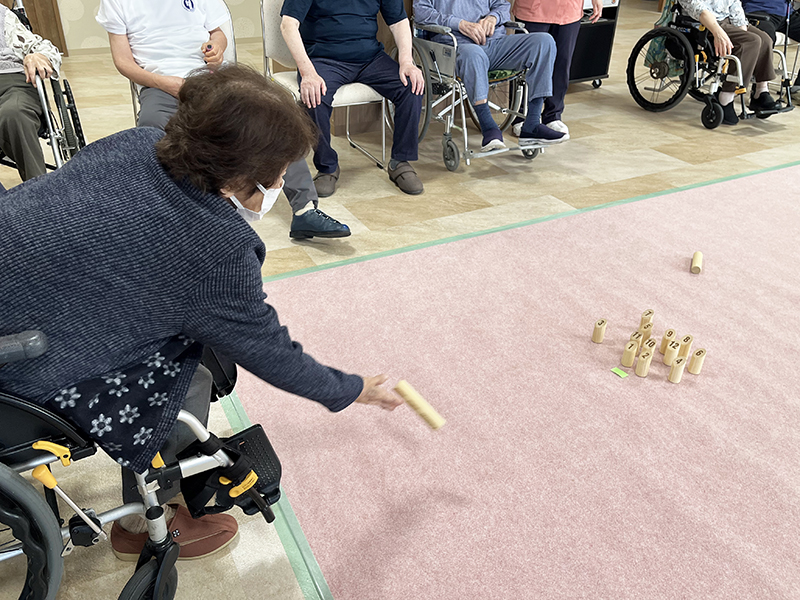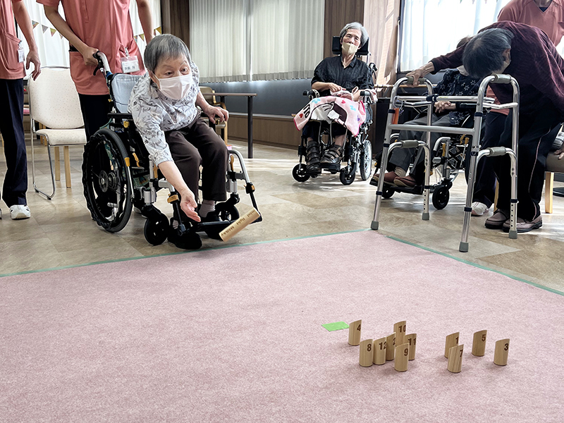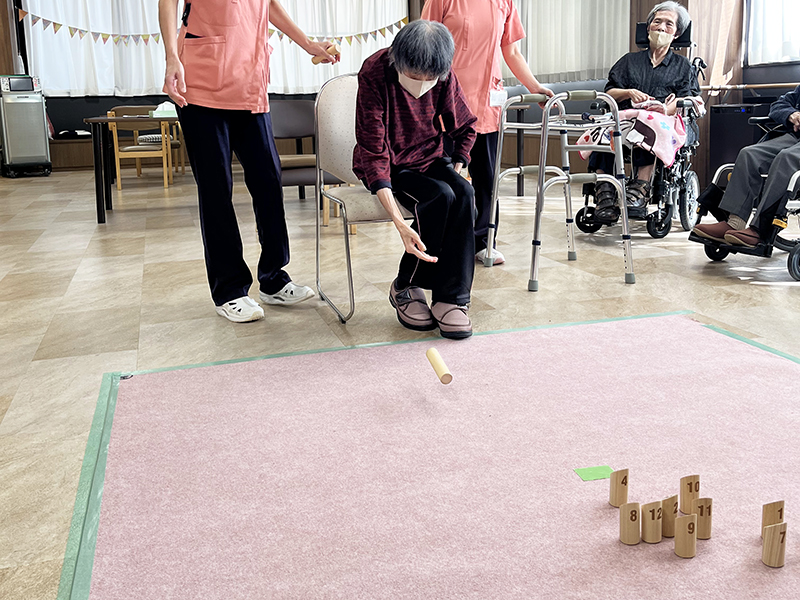 車椅子の方も座ったまま投げられるように工夫し、職員も一体となって大会を盛り上げました。真剣な眼差しでモルックを投げる姿や、高得点が出たときの歓声、惜しくも点数が伸びなかったときの悔しそうな表情など、会場は熱気に包まれました。
